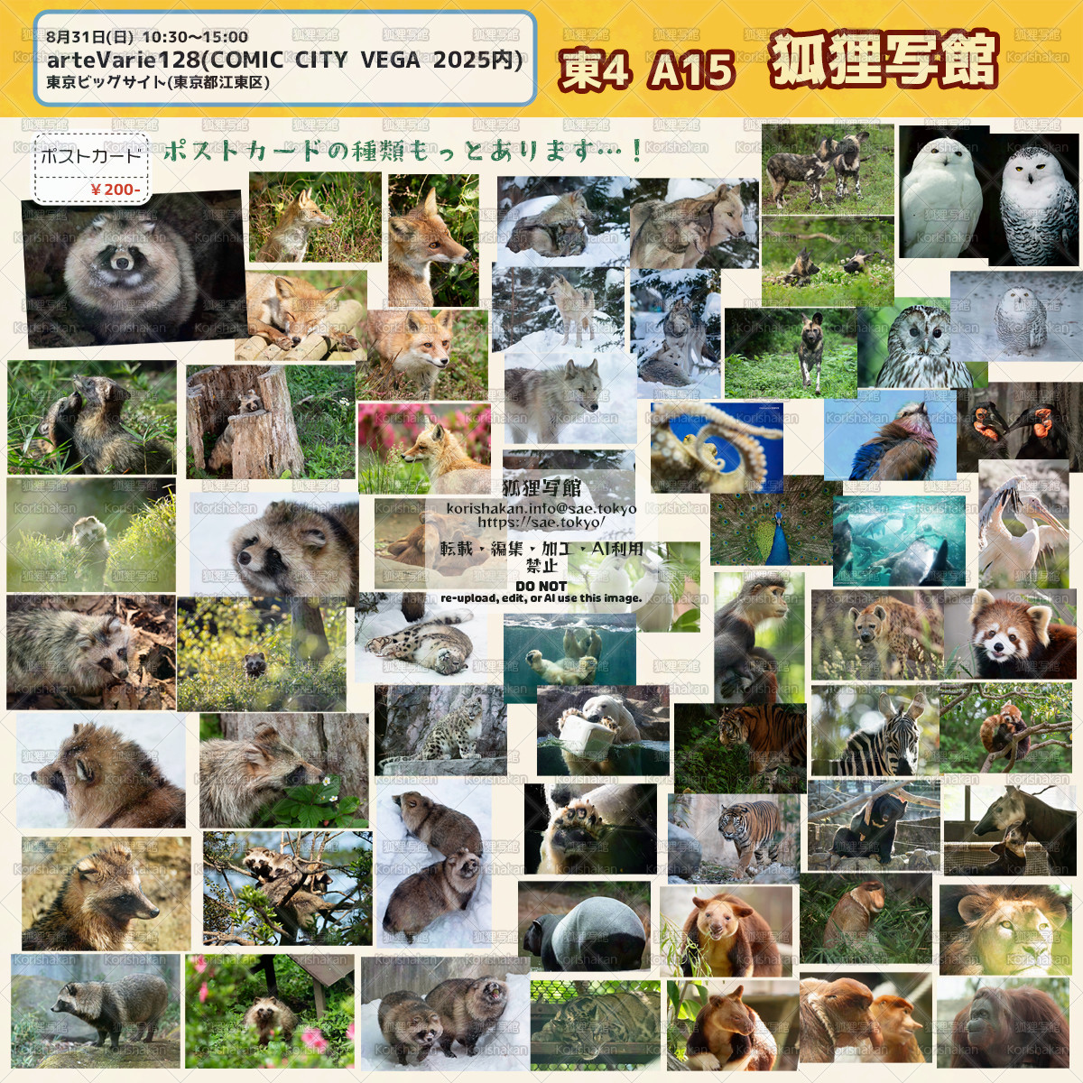 作品、被写体、作家(参加サークル)、他の参加者、作品、キャラクター、イベント主催者など、イベント会場では敬意を持った言動をお願いします。「タヌキってよく轢かれてるよねw」「この写真の動物なに?きもいw」など、スペース前での会話はほとんど聞こえてます。