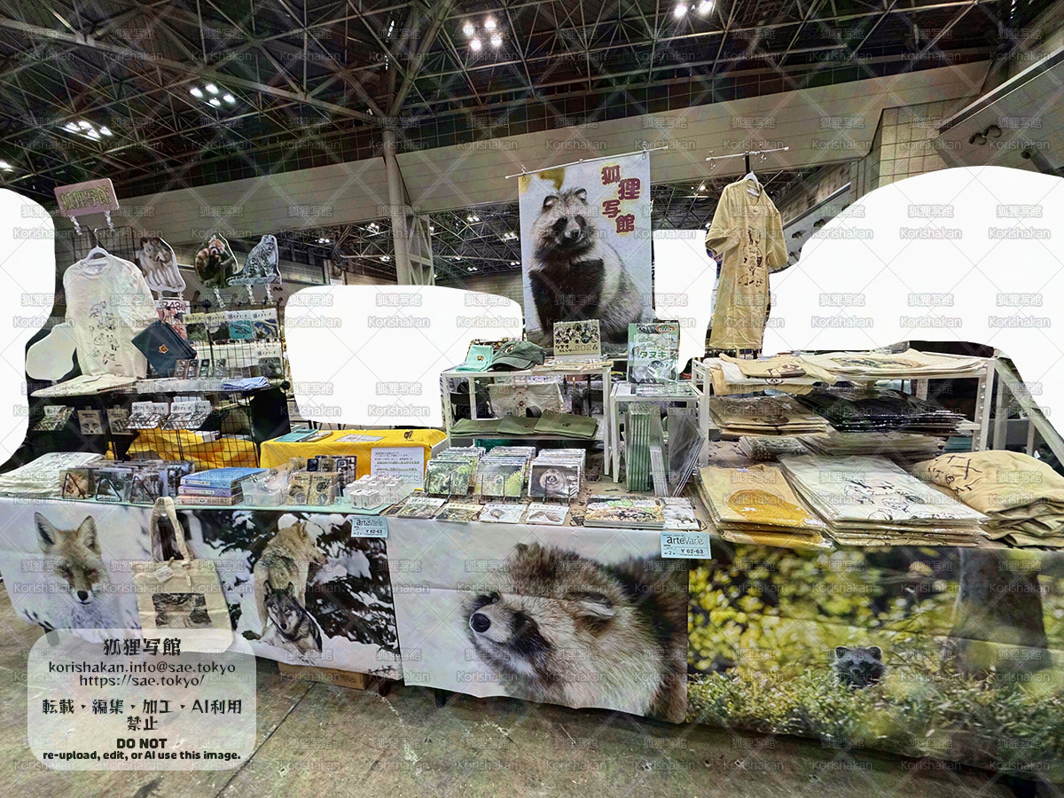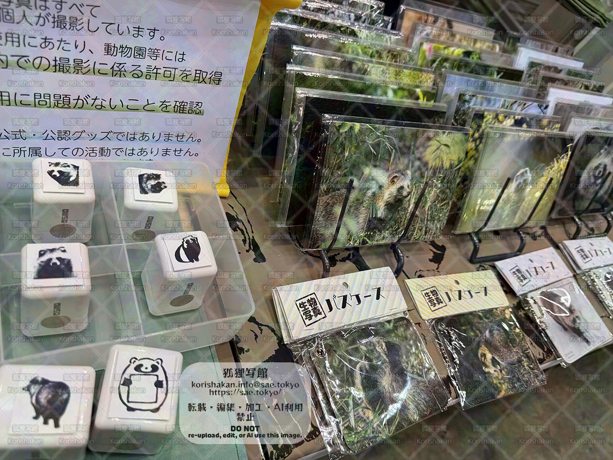 「タヌキ」側。こちらにのみ机をもう一卓借りました。奥行のあるポストカード用什器を置いて、更に手前側に薄いパスケースを平置き。